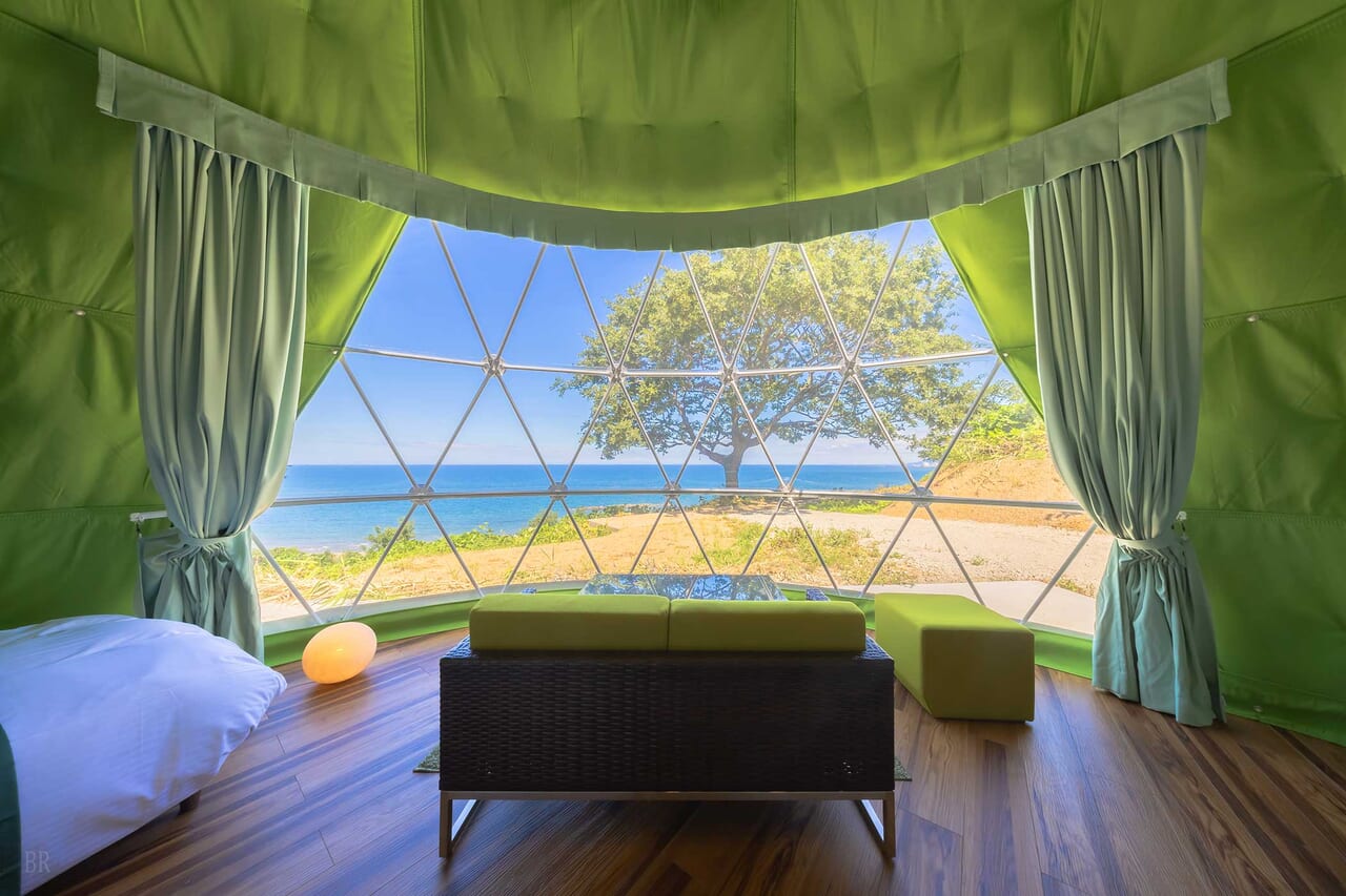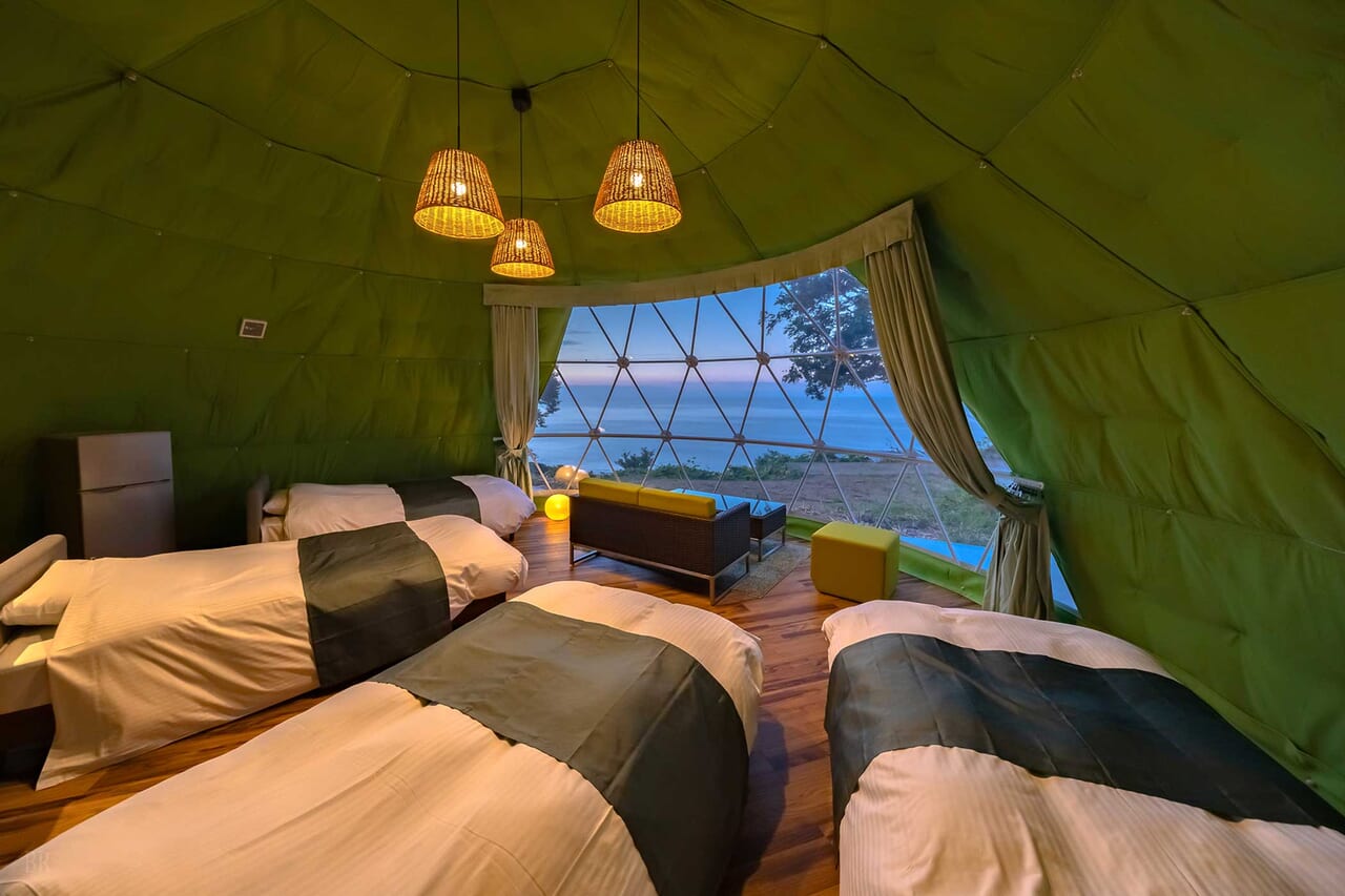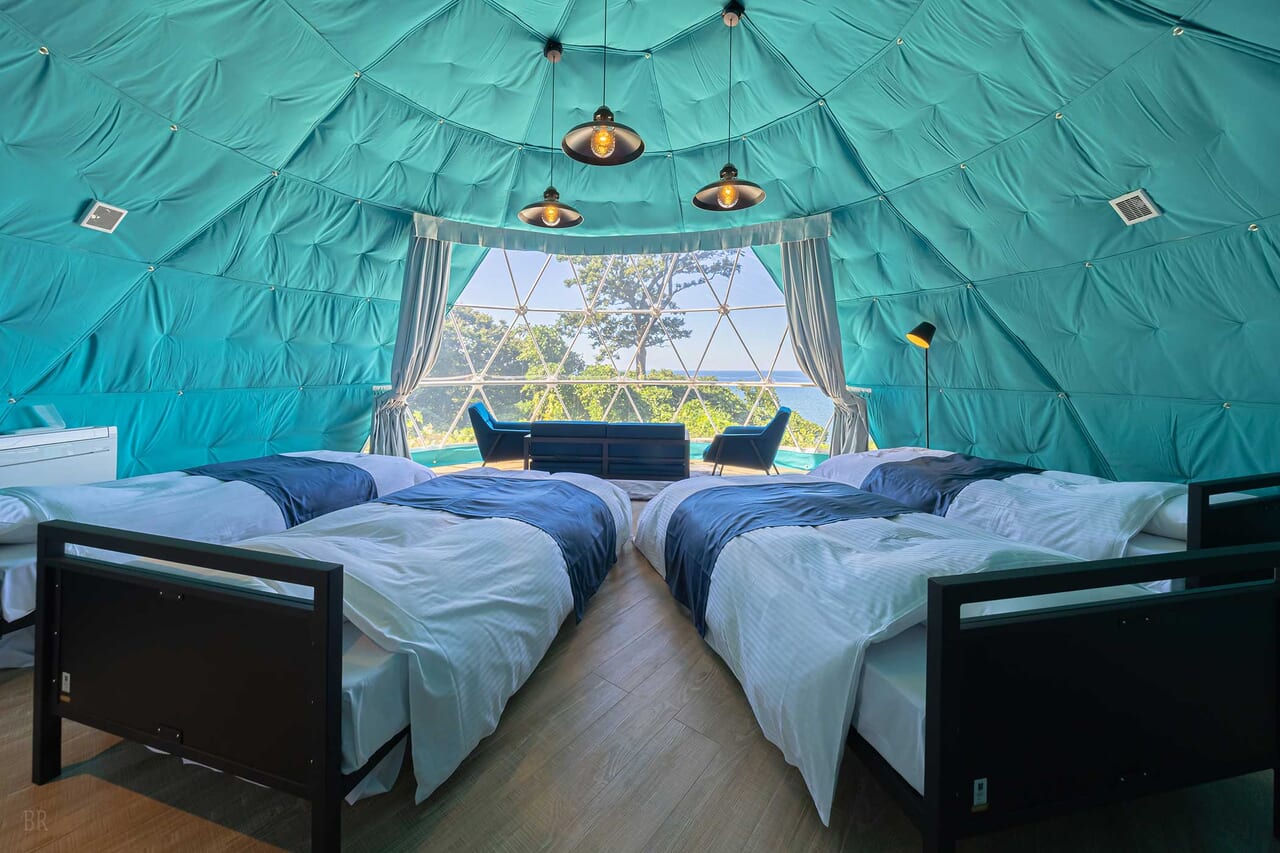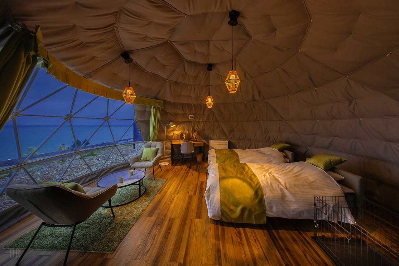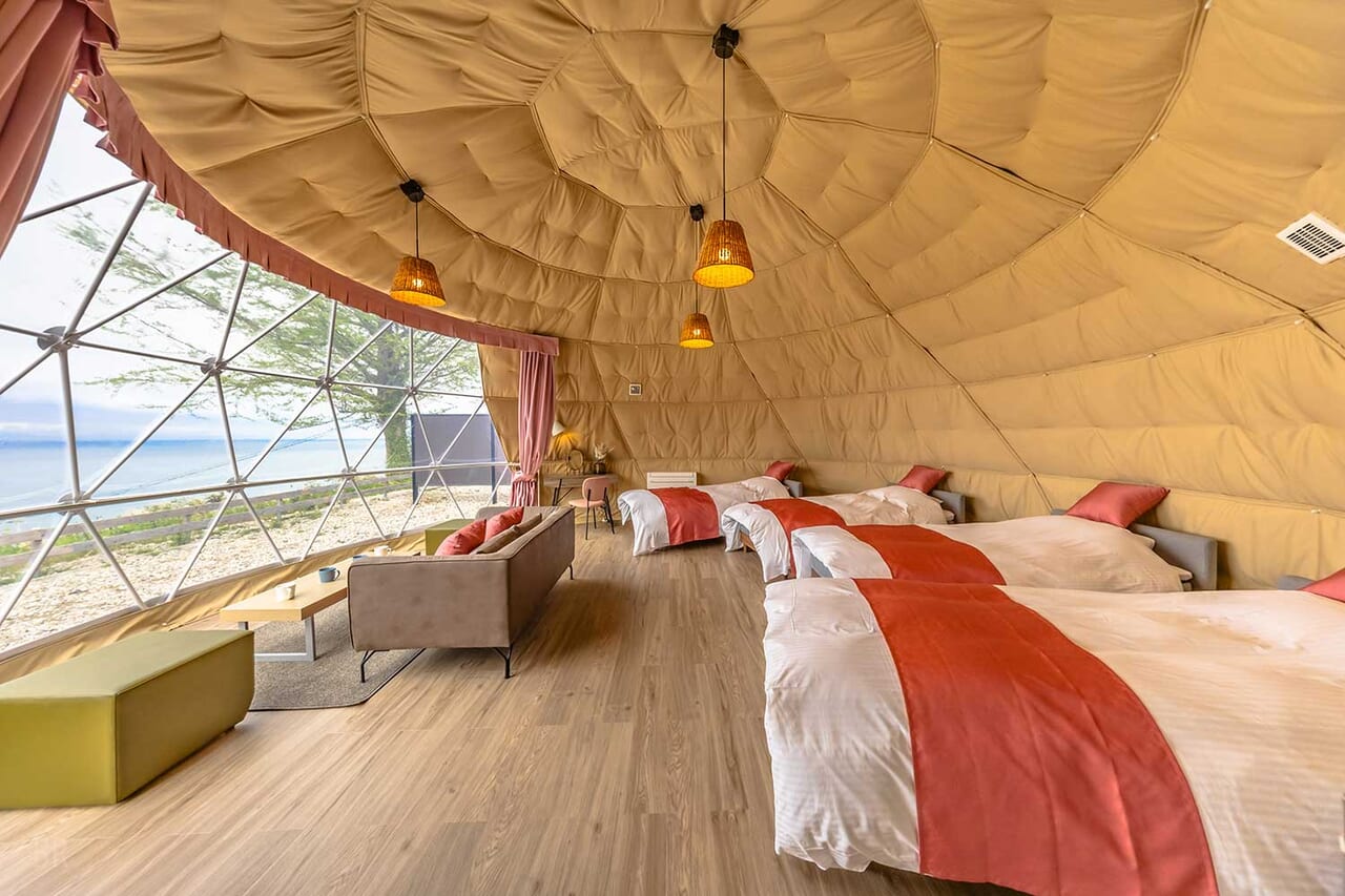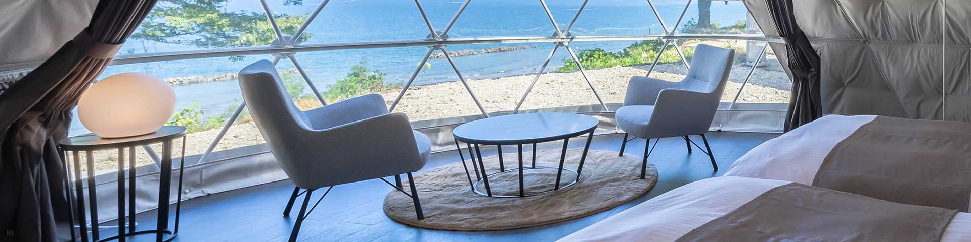 | 備考 | 海を見渡す6mのドームテントです。 洗練されたモダン空間が広がるお部屋でゆったりとお過ごしください。 予約する |