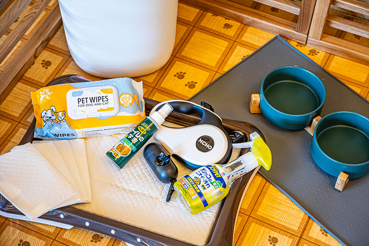 ケージ、ロングリード、トイレ、トイレシート、タオル、エチケット袋、お散歩バック、ウェットティッシュ、除菌消臭スプレー、粘着ローラー、食器