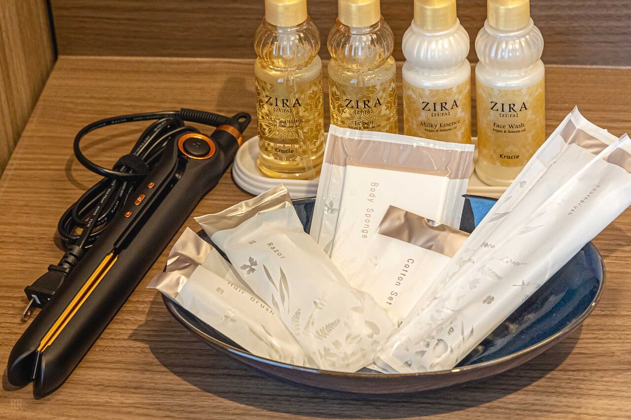 バスタオル、フェイスタオル、バスマット、シャンプー、コンディショナー、ボディソープ、ドライヤー、化粧水、乳液、歯ブラシ