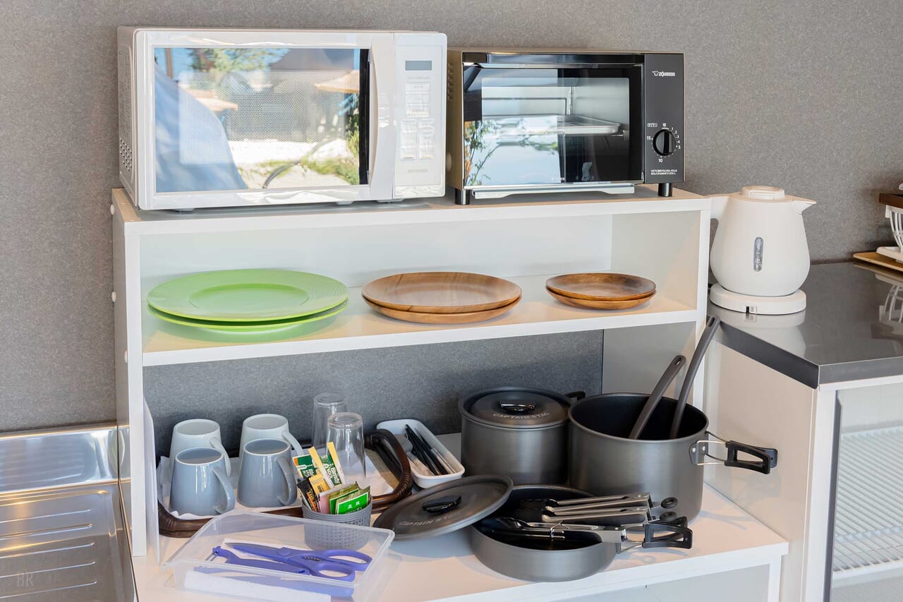 冷蔵庫、エアコン、電気ケトル、カガミ、ハンガーラック、コンセント、ドーム内ゴミ箱、食事スペースゴミ箱、ティッシュ、BBQグリル、包丁、まな板、調理ばさみ