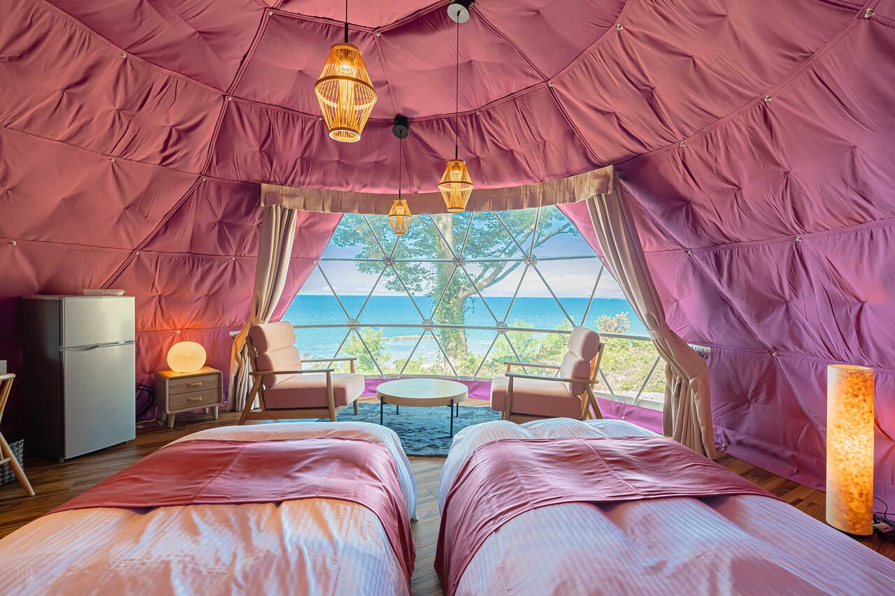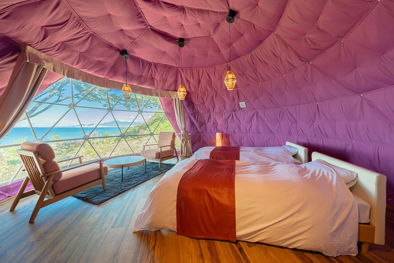 | 備考 | 海を見渡す6mのドームテントです。 桃紫⾊の可憐で キュートな空間のお部屋で非日常をご堪能ください。 予約する |